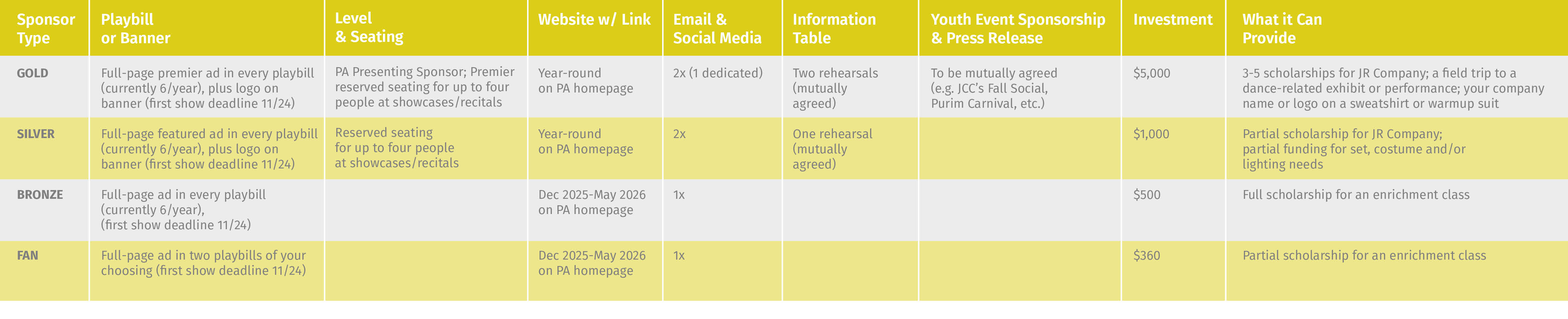 • GOLD: All of the above PLUS Presenting Sponsor recognition for Land of Sweets; premier reserved seating for up to 4 people at showcases/recitals; a dedicated email and dedicated social media post; and additional sponsorship signage at another JCC youth event.